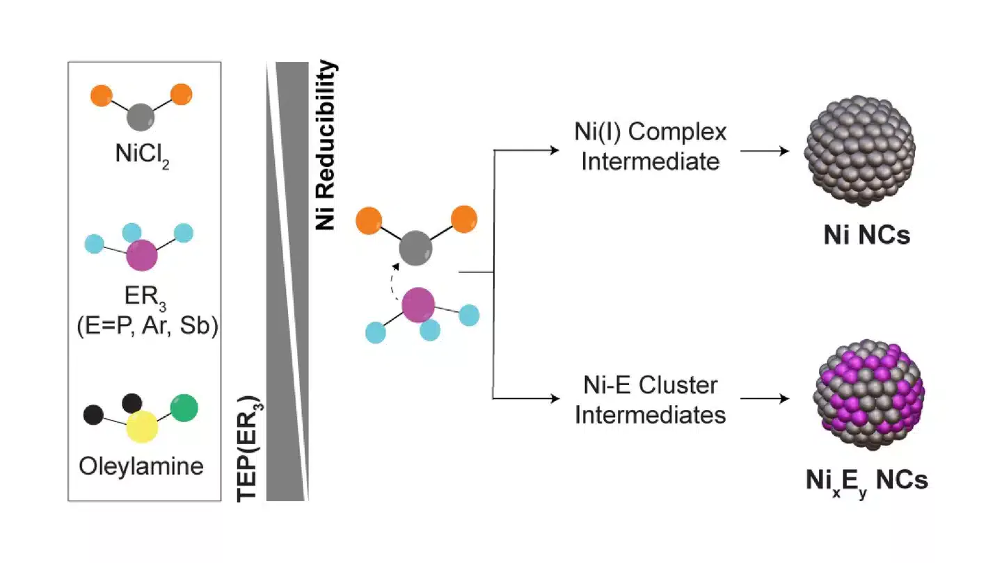 Using a multimodal characterization approach, we reveal that the electronic properties of the ligands critically determine the resulting NC composition: weak σ-donor ligands promote the formation of nickel pnictides NCs via Ni-E cluster intermediates (E = P, As, Sb), while strong σ-donor ligands favor the formation of metallic Ni NCs via a Ni(I) complex intermediate. We explain the ligand-induced reaction pathways via the reducibility of the Ni center. In addition to fundamental chemical insight, this approach enables the synthesis of a diverse library of colloidal Ni-based NCs, including multiply twinned, flower-like, and cubic Ni NCs, as well as Ni2P, Ni12P5, Ni5P2, Ni5As2, and NiSb NCs. This systematic ligand-based approach provides a robust framework for tailoring and understanding the synthesis of transition metal NCs and beyond.