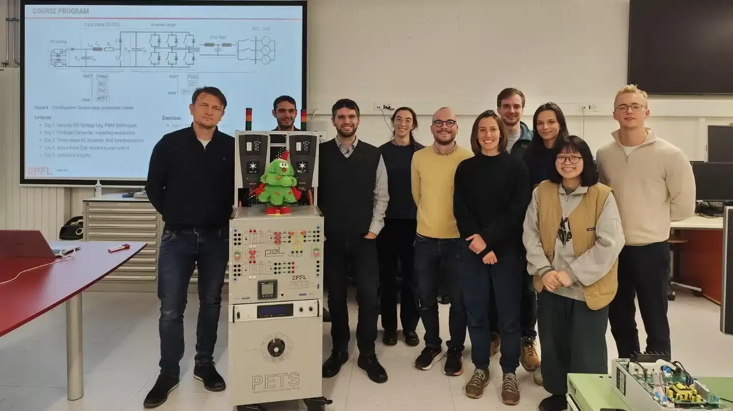 Another year and another edition of the week-long doctoral course ENG-612, "Power Electronics for Renewable Energy Applications," has been successfully concluded by the Power Electronics Laboratory. The morning lectures were delivered by Prof. Drazen Dujic (EPFL) and Prof. Andrea Cervone (KU Leuven), a support during afternoon practical sessions was provided by Dr. Jules Macé, Ms. Gaia Petrillo, and Mr. Israel Yepez Lopez. For the first time, in addition to EPFL PhD students from the doctoral program in Energy (EDEY), we had participation of the PhD students from abroad, namely from KU Leuven. They had a chance to learn about digital control of power electronics converters, motivated by problems of photovoltaic renewable energy generation. Theoretical concepts were simulated and immediately implemented and validated both on the RT-HIL system and Power Electronics Teaching Setups (PETS), successfully establishing grid synchronization and power exchange typical for the grid-connected converters.